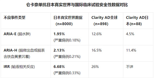 4. 真实世界中的安全性数据: 在日本约8000例仑卡奈单抗的使用案例中,不良事件发生率数据如下: