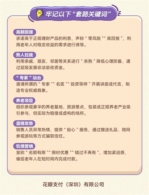 老年群体依然是防范非法金融活动重点宣传对象,养老领域的非法集资手段套路不断翻新,极具欺骗性,常见以“养老服务项目”为噱头,承诺高息保本回报,骗取老年人的养老钱。老年人应牢记以下“套路关键词”,增强防范意识,遇事多与子女沟通。