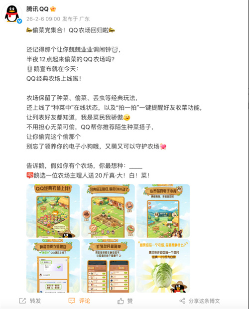 2月6日,腾讯QQ官方宣布,承载数亿用户青春记忆的经典社交玩法“QQ农场”正式回归。即日起,只要在QQ搜索“QQ经典农场”,或于QQ动态页面直接进入,即可体验全新的偷菜乐趣。