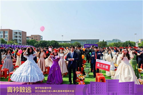 三月春风暖,少年意气扬。3月13日上午,南宁市东盟中学“青衿致远”2026届高三成人典礼暨高考誓师大会在田径场隆重举行。全体高三学子与家长、师长齐聚一堂,共同见证十八岁的成长荣光,吹响决战高考的奋进号角。